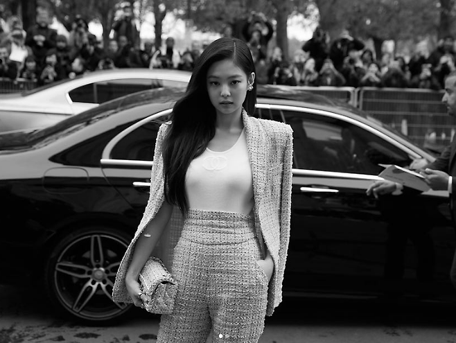 딱붙는 상의에 허리선을 강조해주는 하이웨이스트 하의, 여기에 마른 몸매를 커버해줄 파워숄더 재킷을 툭 걸쳐주면 비로소 제니 룩이 완성되는 것!!