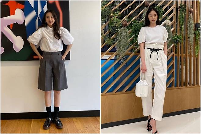 반면, 어깨가 좁고 상체가 작은 소희 같은 타입은 티셔츠를 넣어 입을 때 주의를 요한다.