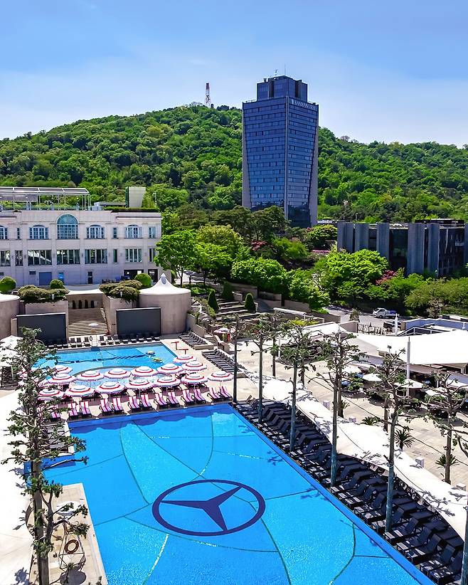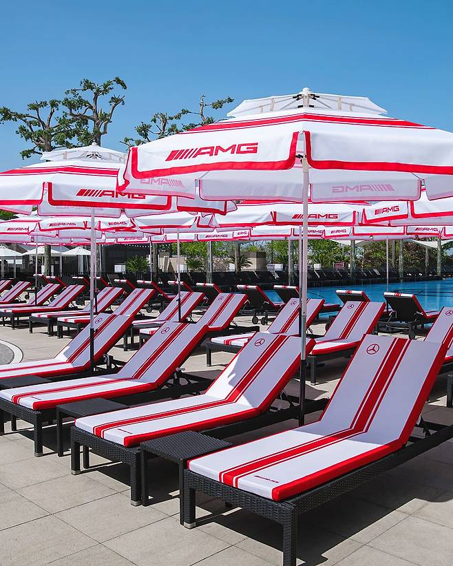 지금 반얀트리 클럽 앤 스파 서울 야외수영장 오아시스에 가면 메르세데스-AMG의 화이트와 레드 컬러 물결을 만날 수 있다. 이번 브랜드 캠페인은 AMG의 다이내믹한 감성과 도심 속 특별한 휴식을 전하기 위해 기획됐다. 오아시스 야외 수영장 바닥에는 대형 삼각별과 AMG 로고 그래픽을 선명하게 입혀, 청량한 분위기 속에서 압도적인 존재감을 발휘한다.