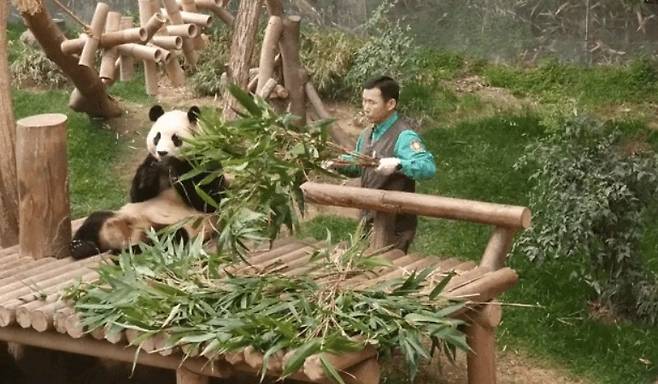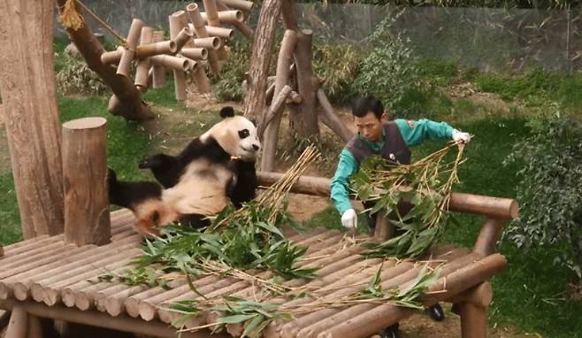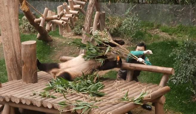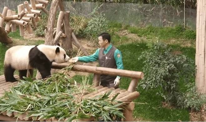 그러면서 사랑 표현법도 배웠는데, 특히 강 주키퍼를 빤히 쳐다보며 먹이를 먹는 모습에서 얼마나 아이가 강 사육사를 좋아하고 의지하는지 알 수 있었습니다. 또 할부지 앞에서 배를 발라당까고 눕는 모습은 얼마나 강바오를 믿는지 알 수 있었죠.