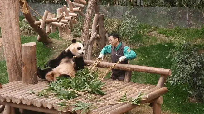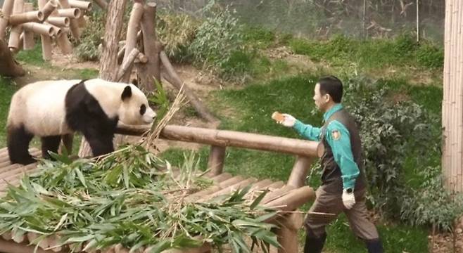 특히 푸바오가 할부지에 대한 사랑이 극한일 때 보여주는 행동은 바로 할부지를 꼭 껴안으려고 달려드는 모습이었는데요. 대나무를 먹다가도 할부지가 옆으로 다가와 댓잎을 정리해주거나, 방사장을 청소해줄 때 푸바오는 할부지를 빤히 쳐다보다가 와락 안으려고 달려들 때가 많았습니다. 넘치는 사랑을 주체하지 못해 어떻게든 할부지를 꼭 안고 싶은 손녀의 마음이었던 것 같은데요.