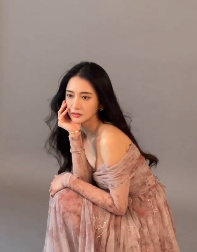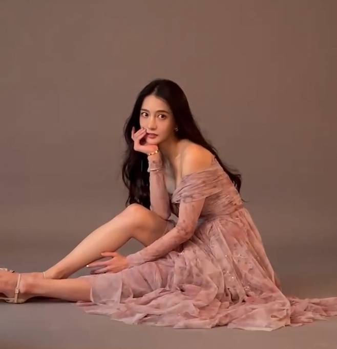 오프숄더 디자인의 시스루 핑크 드레스를 착용해 여성스러운 실루엣을 강조했으며, 튤 소재와 은은한 자수가 어우러져 고급스러운 디테일을 더했습니다.