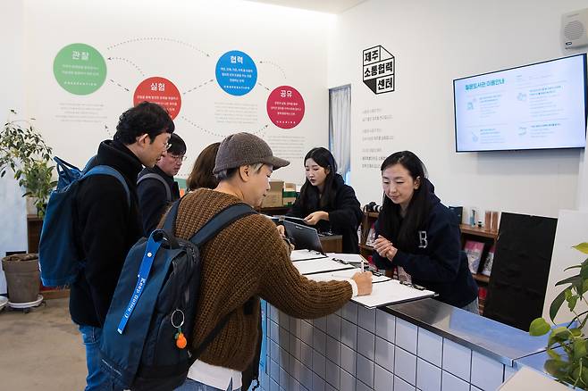 행사 참여를 위해 입장하고 있는, 올 한 해 제주의 지역 문제해결을 위해 노력하신 프로젝트 참가자분들!