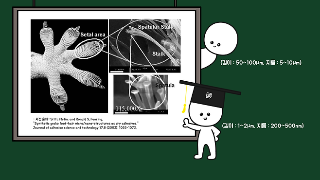 그래도 이러한 도마뱀의 발바닥을 모방해 매우 강력하면서 반복해서 붙였다 뗄 수 있는 테이프를 만들기도 하고, 물체를 흡착하는 용도로 사용할 수 있는 로봇을 만들기도 하기에 무의미한 연구는 아닙니다. 궁금증이 해결되셨나요?