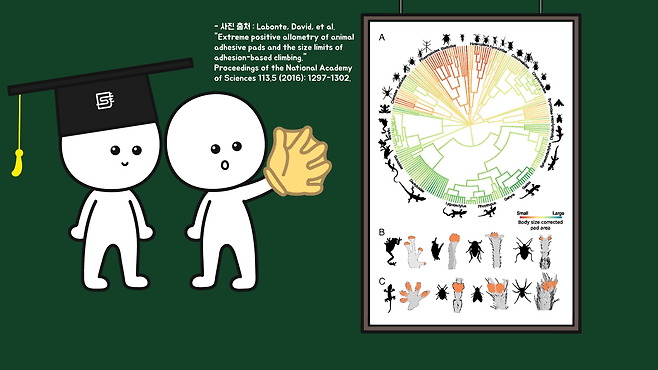 - Labonte, David, et al. "Extreme positive allometry of animal adhesive pads and the size limits of adhesion-based climbing." Proceedings of the National Academy of Sciences 113.5 (2016): 1297-1302. : https://www.pnas.org/doi/abs/10.1073/pnas.1519459113, https://www.dongascience.com/news.php?idx=9814