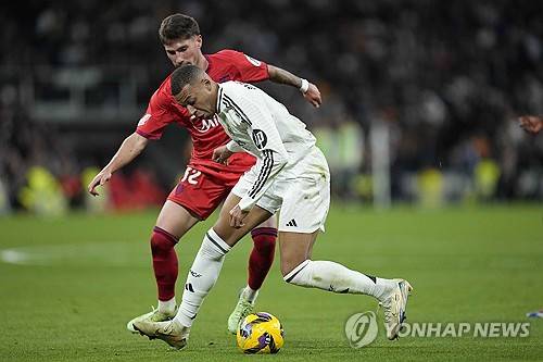 Real Madrid's Kylian Mbappe challenges for the ball with Sevilla's Jose Angel Carmona during the Spanish La Liga soccer match between Real Madrid and Sevilla at the Santiago Bernabeu Stadium in Madrid, Spain, Sunday, Dec. 22, 2024. (AP Photo/Bernat Armangue)