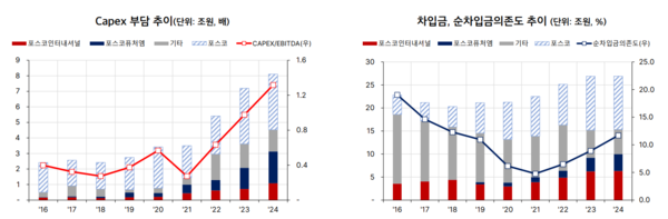 포스코그룹은 2022년부터 이차전지 부문에 적극적으로 투자하면서 설비투자(CAPEX) 규모가 크게 늘어났지만, 상각전영업이익(EBITDA)은 둔화하고 있다. 포스코그룹은 풍부한 유동성을 바탕으로 투자를 원활히 진행하고 있으나 차입 부담은 증가하는 추세다.