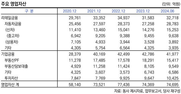 실제로 메리츠캐피탈도 별도 기준 순이익을 보면 올해 상반기 664억원을 기록해 전년 동기 1197억원 대비 44.5% 급감했다. 설립 이래로 메리츠캐피탈의 순이익이 역성장한 것은 지난해가 처음인데 부동산 PF발 실적부진이 지속되고 있는 것이다. 메리츠캐피탈의 영업자산은 크게 자동차금융으로 대표되는 리테일금융 부문, 부동산 PF와 해외 대체투자를 포함한 기업금융 부문이 4대6 비율로 나뉜다. 이 중 부동산 PF와 부동산담보대출이 상반기 말 기준 각각 1조5417억원, 9549억원으로 기업금융 부문의 60%를 차지한다.