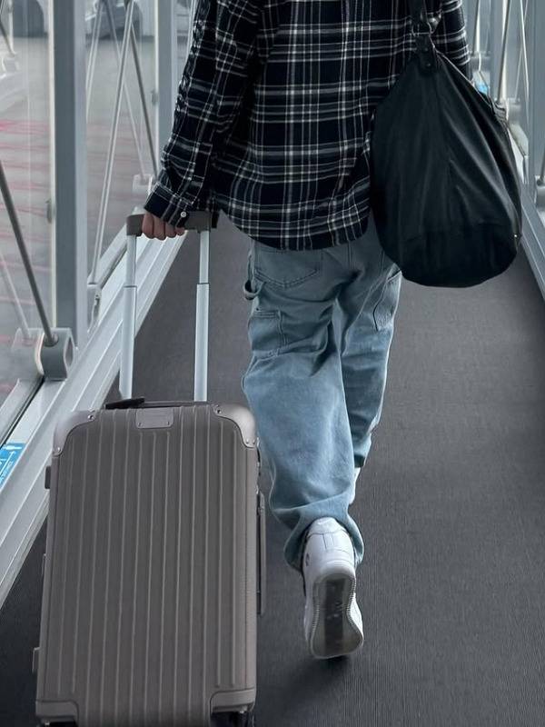 체크 패턴 아우터에 연청바지를 매치하고, 검은 보부상 가방을 더한 스타일에서는 활동량이 많은 그의 라이프스타일이 자연스럽게 드러나네요.