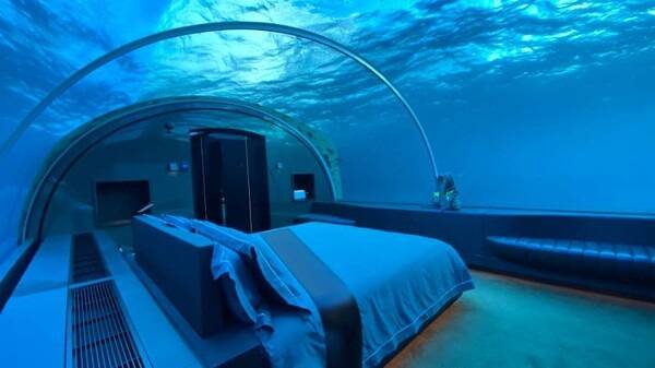 더 무라카의 가장 큰 특징은 바로 수중에 위치한 침실입니다. 해수면에서 5미터 아래에 위치한 이 침실은 180도 곡선형 아크릴 돔으로 되어 있어, 마치 수족관 속에 있는 것처럼 해양 생물들을 가까이에서 관찰할 수 있어요. 침실뿐만 아니라 욕실과 옷장도 바다를 향한 통유리로 되어 있어 어디서든 바다 속 풍경을 감상할 수 있습니다.