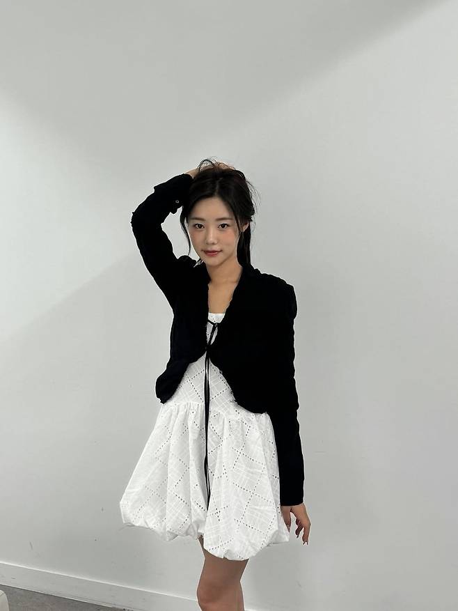 이번 스타일링의 중심은 블랙 크롭 재킷과 화이트 펀칭 디테일이 돋보이는 원피스다. 하늘하늘한 원피스 위에 얇은 재킷을 매치해 전체적인 실루엣에 구조감을 부여했으며, 허리 라인을 자연스럽게 잡아주어 여성스러운 무드를 강조했다. 여기에 와이드한 데님 팬츠를 매치해 소녀스러움과 캐주얼함을 동시에 살리는 믹스매치 코디를 완성했다.
