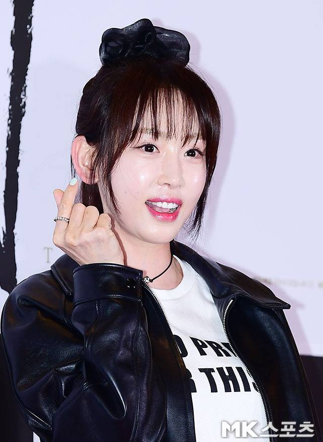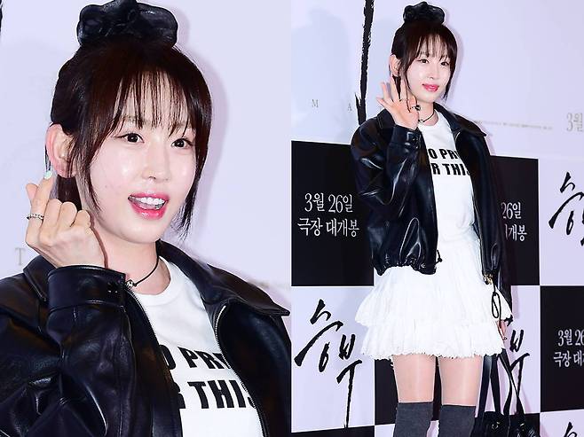 블랙 가죽 재킷으로 시크한 매력을 강조한 반면, 화이트 티셔츠와 프릴 미니 스커트로 발랄한 분위기를 더했습니다.