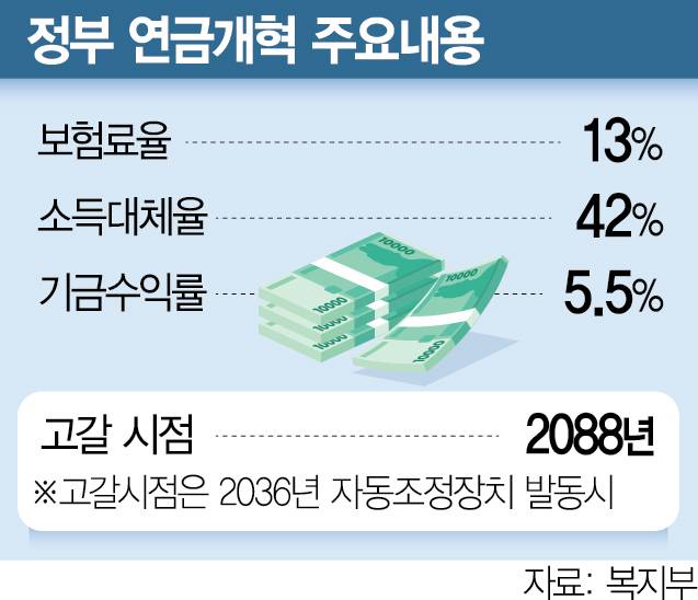정부가 국민연금 보험료율을 현행 9%에서 13%로 올리고 소득대체율은 지금의 42%를 유지하는 내용의 연금 개혁안을 발표했다. 소득대체율 인상은 최소화하는 대신 기초·퇴직연금을 강화해 실질적인 노후 소득을 보장하고 연금재정의 건전성도 지키겠다는 내용이다.