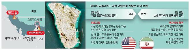 미군이 이란의 경제적 생명줄인 핵심 석유 수출 기지 하르그섬의 군사 시설 90여 곳을 타격하자 이란이 아랍에미리트(UAE)의 주요 석유 수출 거점인 푸자이라 항구를 공격하며 맞불을 놨다. 양측의 공격 수위가 격렬해지는 가운데 전선이 확대되는 양상이다.