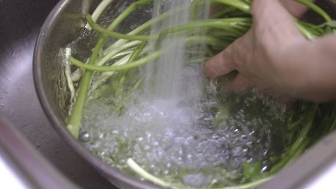 물에 깨끗이 여러 번 씻은 후에 손가락 두 마디 정도 길이로 썰어 주세요.