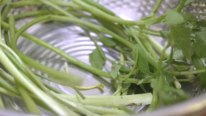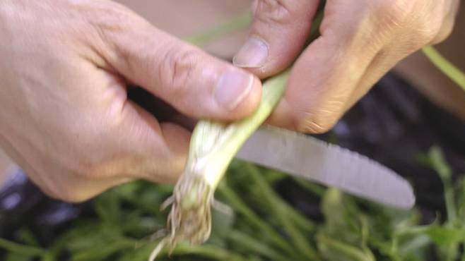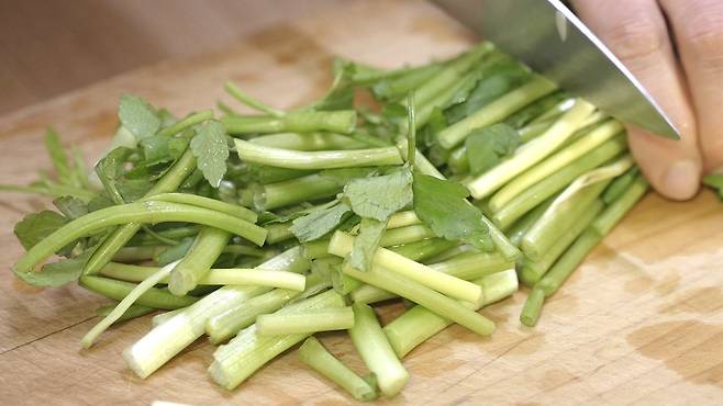 먼저 미나리 뿌리 부분은 자르고 떡잎은 제거해 주세요.