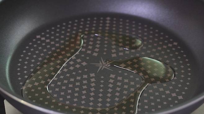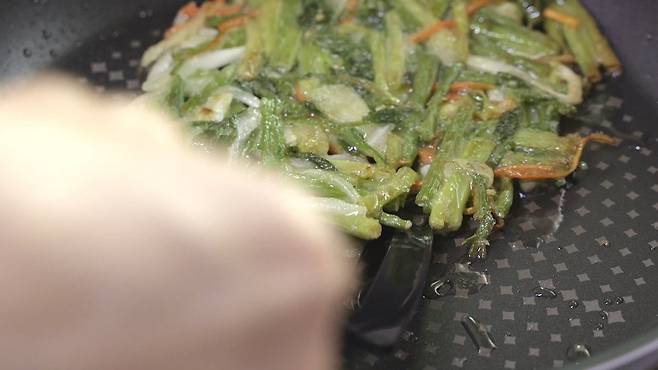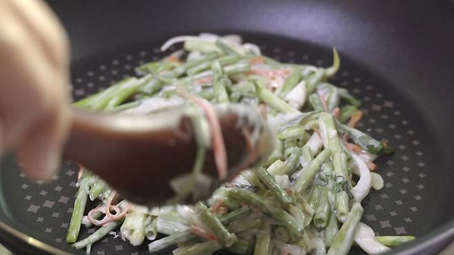 두툼한 프라이팬 '중불'에서 미나리 전을 넣고 넓게 펴서 부쳐 주세요. 식용유를 넉넉히 두른 후 부쳐야 바삭하고 잘 부쳐져 더욱 맛있게 즐길 수 있어요.