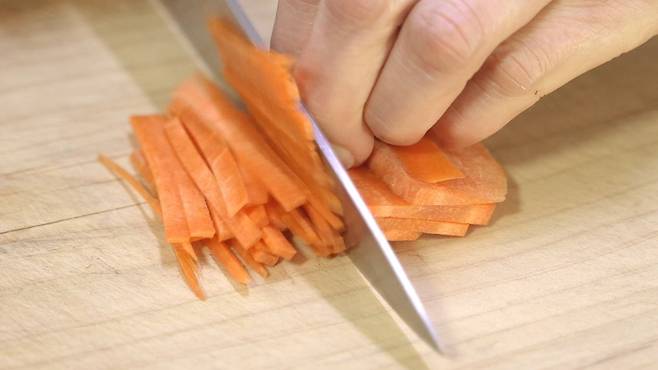 당근, 양파는 채썰기, 고추는 송송 썰어서 재료를 준비해 놓으세요. 미나리 전에는 여러 가지 야채가 함께 들어가 건강에 더욱 좋은 음식이에요.