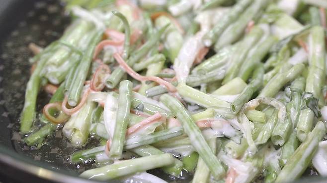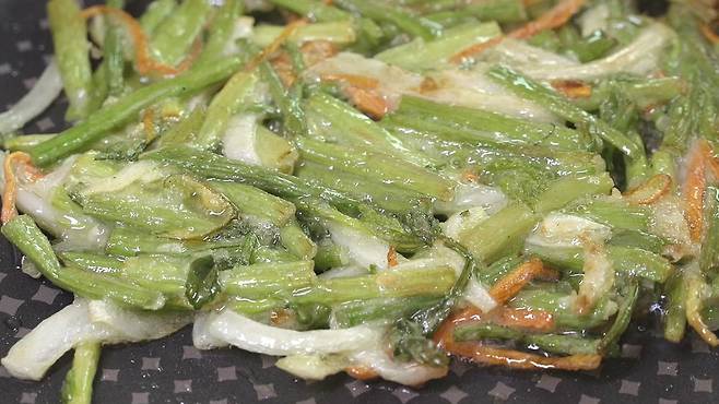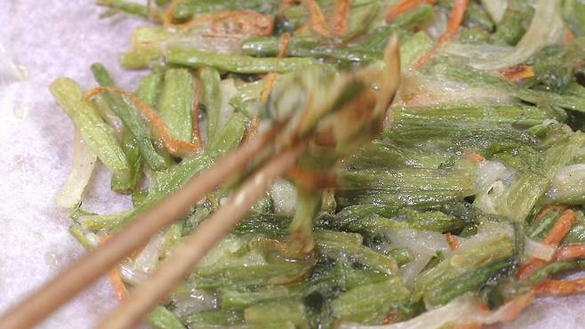 향긋한 맛이 참 좋은 미나리 전! 미나리는 해독작용, 피부미용에도 참 좋은데요. 식용유와 함께 전으로 부쳐 먹으면 피부미용에 더 좋다는 사실 알고 계셨나요?