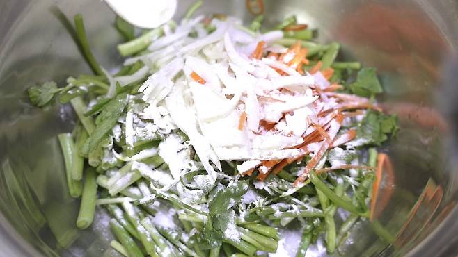 단! 쌀 부침가루를 넣으면 더욱 바삭바삭한 느낌이 좋은 것 같아요.