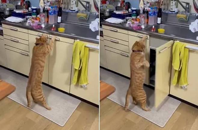 사연은 이렇습니다. 고양이를 키우는 집사는 SNS를 통해 앞발로 스냅을 날리는 듯 행동하더니 결국 싱크대 수납장 문을 여는 고양이 일상을 공개했는데요.