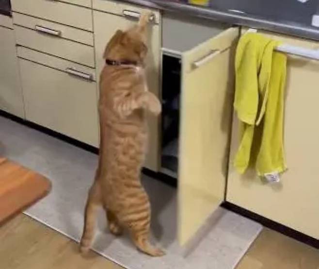 잠시후 고양이는 싱크대 수납장 앞에 두 발로 일어서더니 앞발로 손잡이를 만지작 거리는 것이 아니겠습니까.