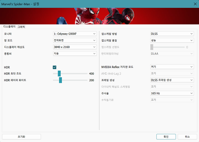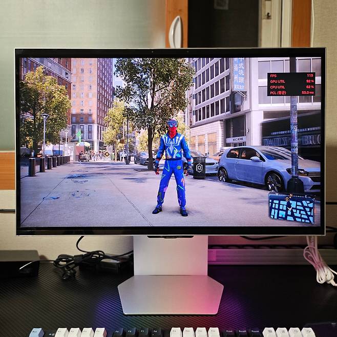 165Hz 주사율로 좌우로 빠르게 움직여도 끓김없이,부드럽고 매끄러운 화면을 보여주는 모습을 스파이더맨2 에서 확인 할 수 있었습니다