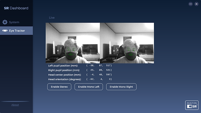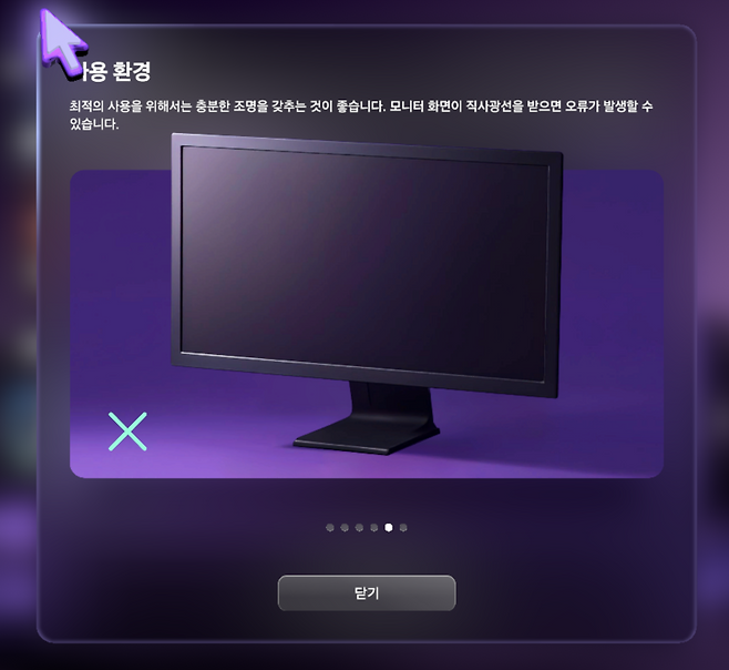 모니터 화면은 사용자와 일직선상에 위치하도록 하는것이 좋은데요. 이는 모니터 중앙 상단에 위치한 상단에 2개의 레티큘라 렌즈가 아이트래킹 알고리즘으로 제 눈을 추적, 보여지는 영상을 입체적 3D 처럼 보여주는걸 도와줍니다 모니터 화면과 사용자의 눈 거리는 최적 거리가 70cm 이며 동작 기능 범위가 55cm~95cm 입니다.