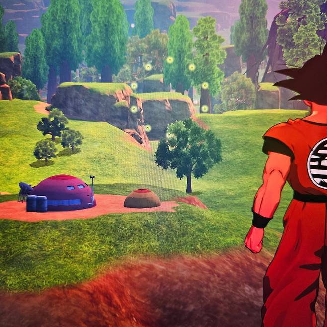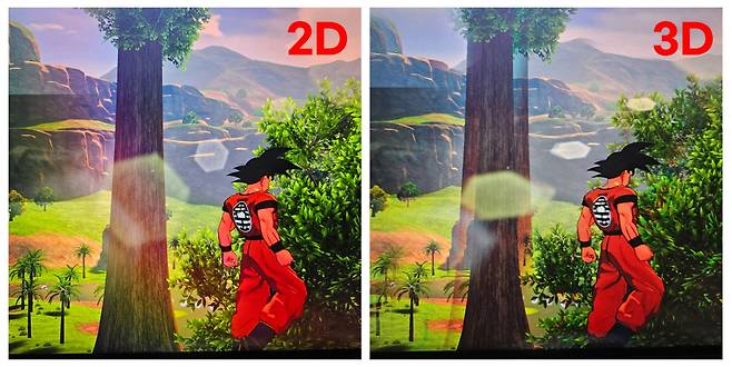 실제 눈으로 들어오는 손오공은 마치 제 눈앞에 있는거 같은 모습을 입체감 있게 보여줬습니다 돌출감을 셋팅시 게임화면이 줄었다가 늘었다가 하는 모습으로, 배경을 멀리 있는것처럼 입체감 있게 해줍니다