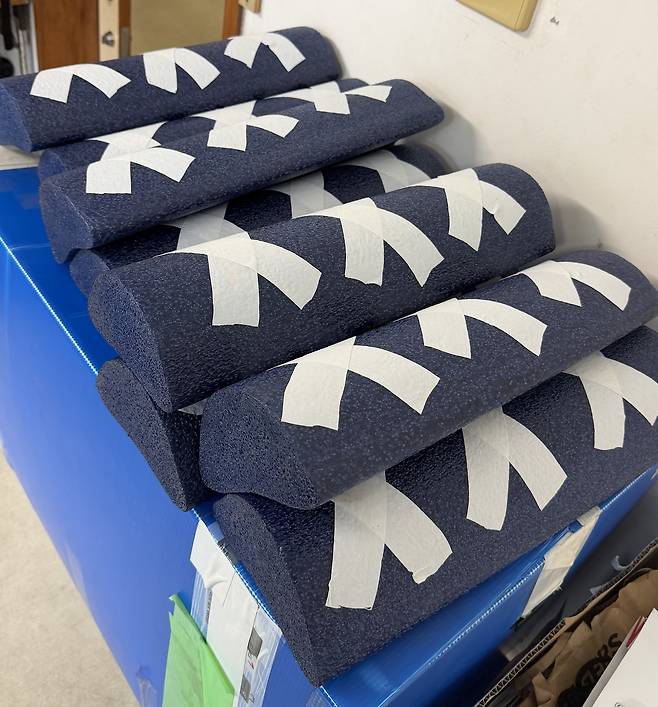 폼롤러에 테이핑을 해 그럴듯한 윷가락을 완성했다.