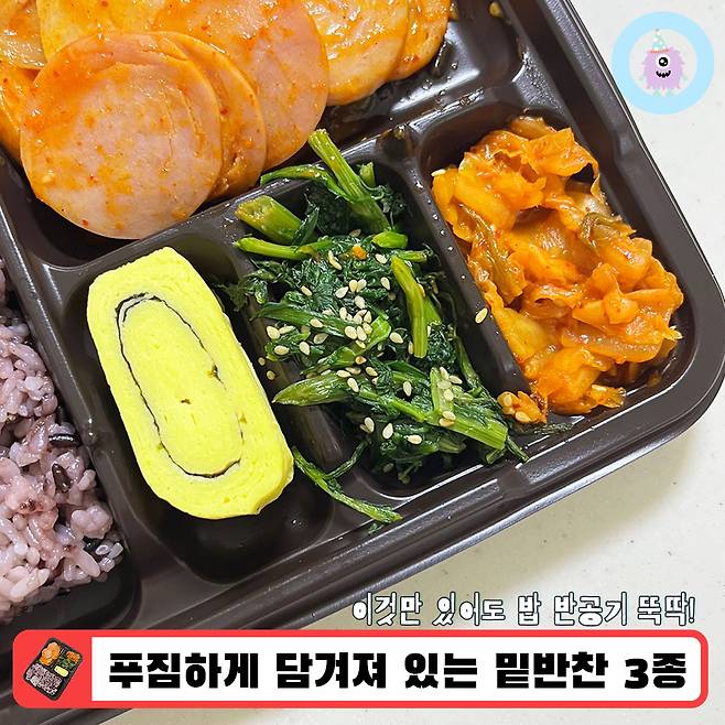 밑반찬은 총 세 가지가 들어있는데 각각 김 계란말이, 쑥갓나물 무침, 볶음김치에요~!! 가격 대비 밑반찬 양도 넉넉해서 역시 혜자로운 도시락이다 생각했답니다ㅋ.ㅋ