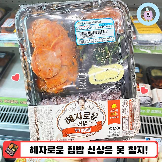 그러던 중 GS25 편의점 인스타그램에서 '혜자로운 집밥' 도시락 신상 소식을 보게 되었어요. 무려 고소한 버터가 들어있는 부대볶음 구성이라는 말에 곧장 구매하러 다녀왔답니다.