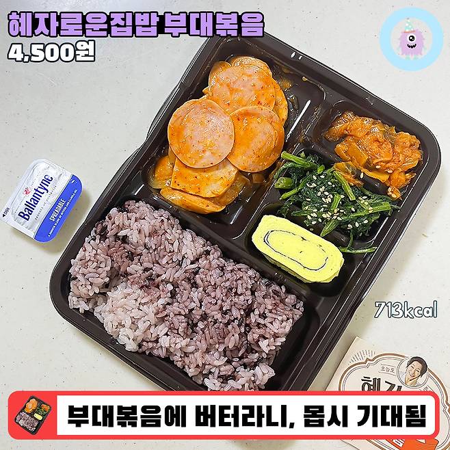 가격은 제육볶음과 동일한 4,500원이었고 할인은 없는 듯했어요. 흑미밥과 부대볶음, 밑반찬 3종, 버터로 구성되었고 칼로리는 총 713kcal라고 해요! 한끼 식사로 적당한 칼로리지만 국물이 먹고 싶어서 라면이라도 뜯는 날엔 1천 칼로리를 넘기는 건 일도 아닐 듯요..!!