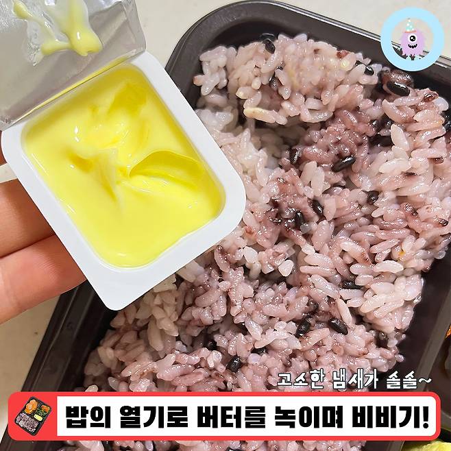 반찬들을 두루 둘러봤으니 이제 본격적으로 먹을 준비를 해보아요! 700W 전자레인지에 2분30초 돌려준 따끈한 밥에 버터를 비벼 주었어요! 밥의 열기에 버터가 녹아 골고루 비비기 편해진답니다.