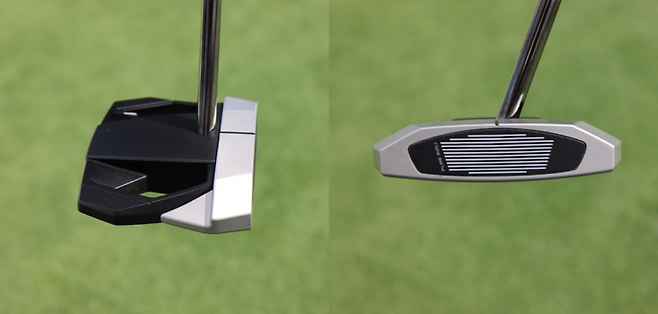 테일러메이드는 이번 퍼터에도 자사의 대표적인 ‘퓨어 롤(Pure Roll)’ 인서트를 적용한 것으로 보입니다. 가로 방향의 그루브가 스키드를 최소화하면서도 더욱 안정적인 전진 롤을 만들어내는 역할을 하죠. 확실하진 않지만, 퓨어 롤 인서트는 보다 부드러운 타구감과 조용한 타격음을 제공하는 TPU 버전으로 보입니다. 또한, 솔 부분을 보면 무게 조절을 위한 세 개의 웨이트가 탑재된 것을 확인할 수 있습니다. 두 개는 페이스 근처에, 하나는 중앙에 배치되어 헤드 무게를 정밀하게 조정할 수 있도록 설계되었습니다.