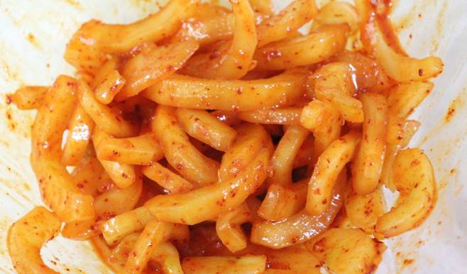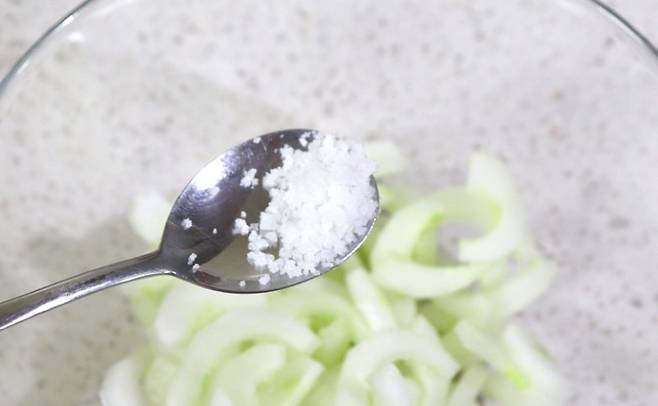 얇게 썰어 소금에 살짝 절이기 (5~10분) 수분이 빠지고 아삭함이 살아납니다. 물에 한 번 헹궈 소금기를 빼주는 것도 중요합니다.
