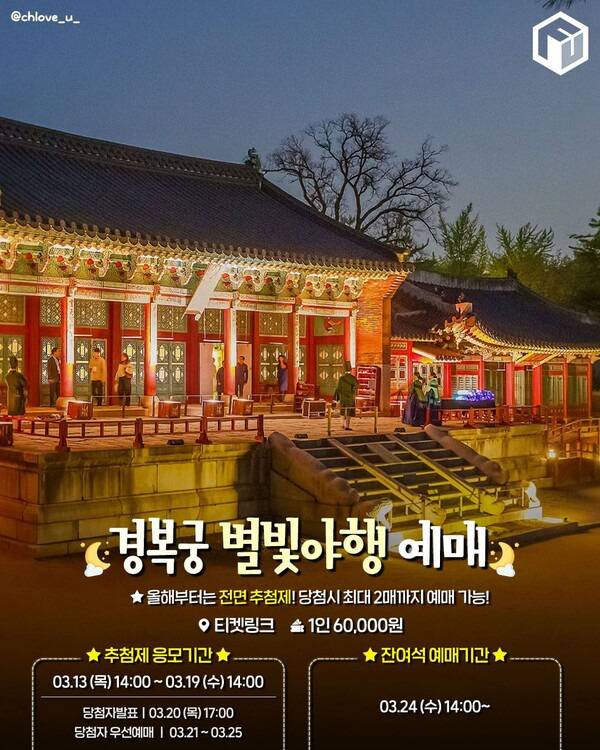 사전 응모에 당첨된 뒤, 본예매에서 추천드린 좌석을 참고해 예매한다면 보다 만족스러운 경복궁 별빛야행을 감상할 수 있을 것입니다.
