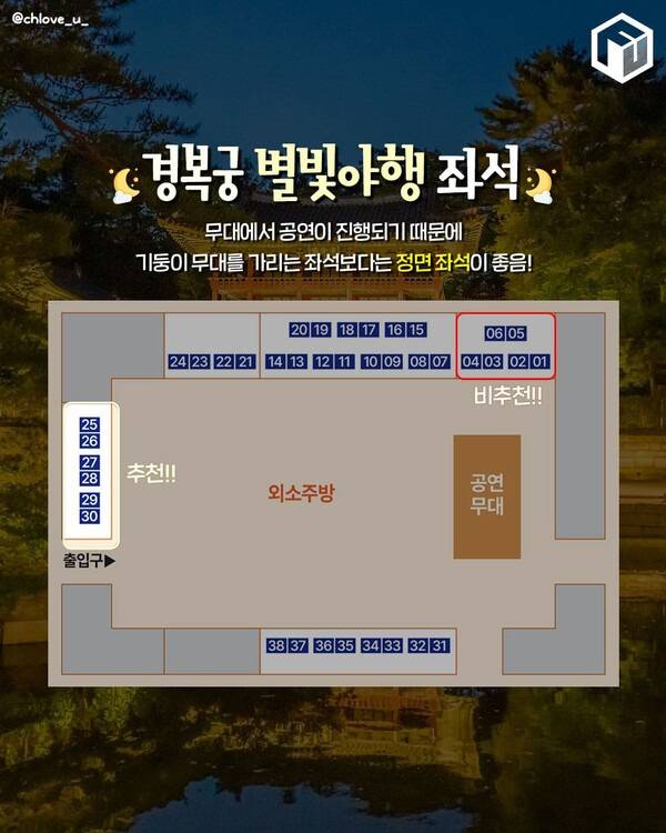 경복궁 별빛야행 후기에 따르면 무대 바로 옆 좌석인 1~6번 좌석은 공연자들의 측면 또는 뒷모습이 보여 추천하지 않습니다. 21~22번 역시 기둥에 무대가 가려 시야 확보가 여러워 비추천하는 경복궁 별빛야행 좌석이죠. 물론 2열에 위치한 좌석도 상대적으로 공연 관람에 어려움이 있겠죠?