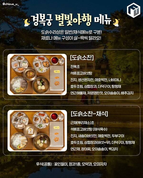 2025 경복궁 별빛야행 도슭수라상 메뉴는 작년과 동일합니다. 기본적인 구성은 동일하지만, 채식 메뉴를 선택할 경우 요리에 사용되는 재료가 채식으로 변경됩니다.