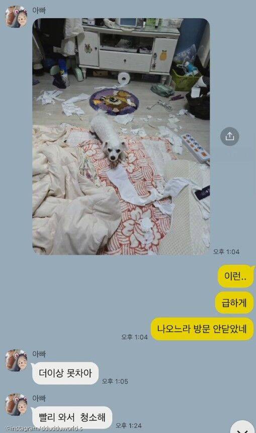 또다시 방 안에서 휴지를 갈기갈기 뜯어놓은 뚜뚜. 아버지는 "더 이상 못 참아" "빨리 와서 청소해"라고 메시지를 보내셨는데요.