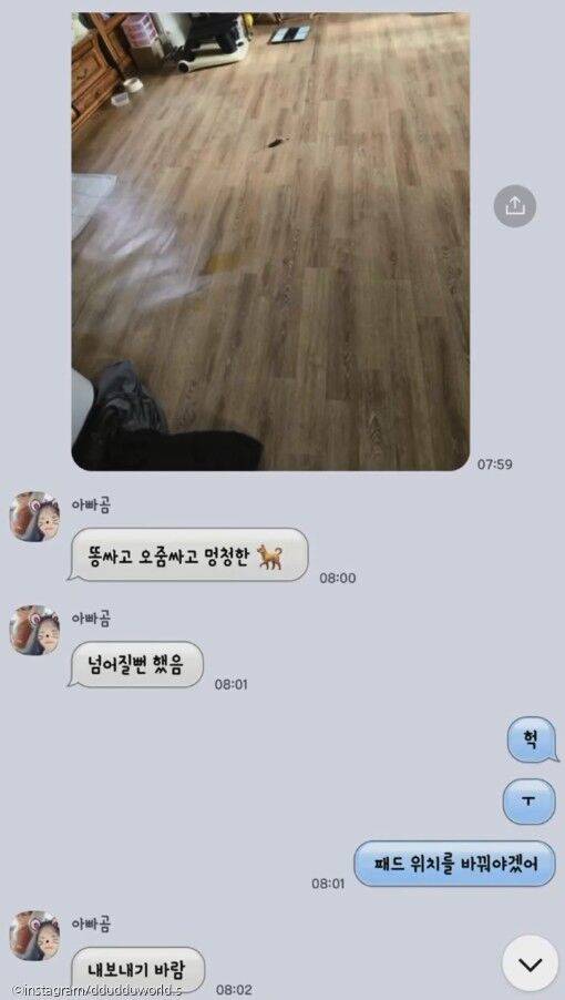 게다가 활기찬 뚜뚜의 에너지는 집안에 문제를 일으켰습니다. 영상 속 준혁 씨가 아버지와 주고받은 메시지에는 아버지가 보낸 사진이 보이는데요. 준혁 씨가 나간 사이 뚜뚜가 휴지를 마구 뜯어놓은 모습입니다.