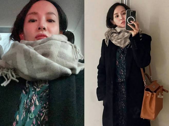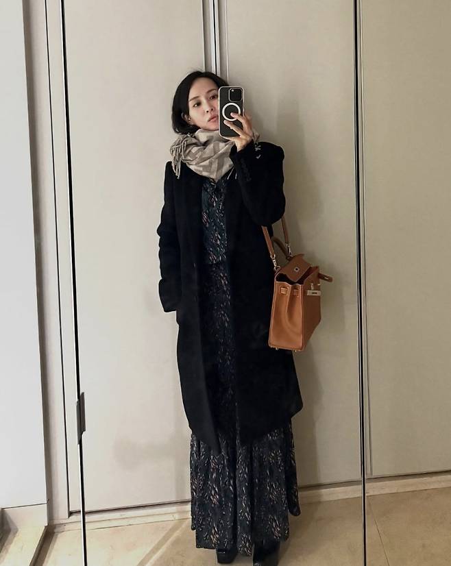조여정은 롱 블랙 코트에 여성스러운 패턴 원피스를 매치하고, 베이지 컬러 머플러와 브라운 톤의 명품백으로 포인트를 주며 우아한 겨울 룩을 완성했습니다.