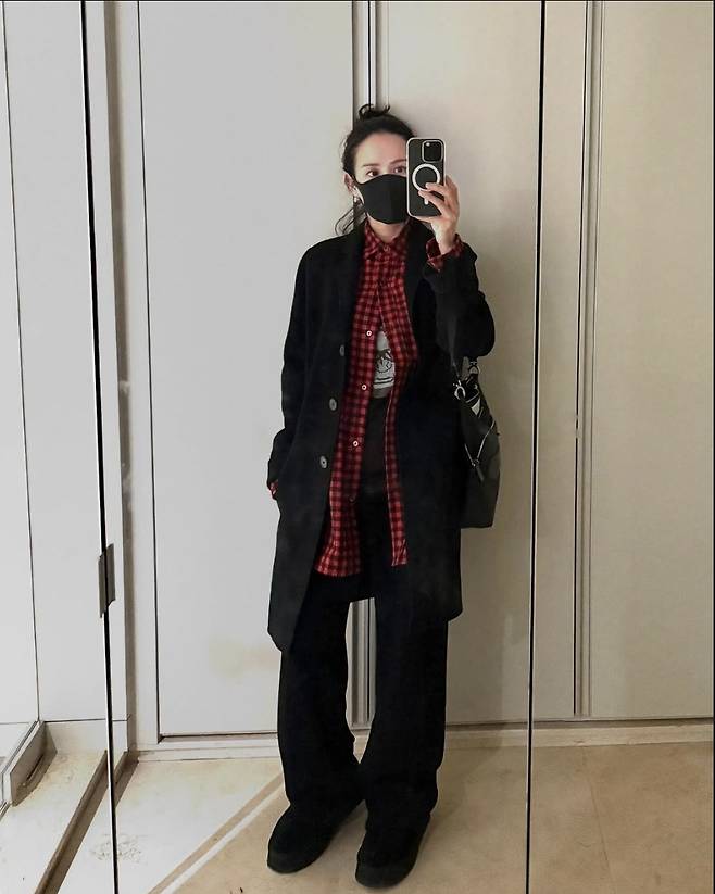 또 다른 룩에서는 체크 셔츠와 블랙 팬츠를 활용해 한층 캐주얼하면서도 감각적인 스타일을 연출했고, 편안한 분위기 속에서도 세련된 감각을 드러냈습니다.