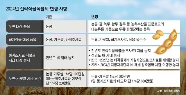 전략작물직불금 지급 대상 품목도 늘어난다. 기존엔 밀·보리·귀리 등 동계 식량·사료 작물과 논콩·하계조사료·가루쌀 등 하계작물이 대상이었다. 내년부터는 논콩을 넘어 팥·녹두·완두·잠두 등 전반적인 두류 품목을 포함한다. 농축수산물 표준코드의 대분류를 기준으로 두류에 해당하는 품목이면 모두 대상이 된다.