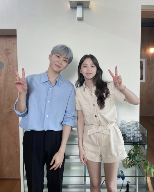공개된 사진 속에는 세븐틴의 멤버인 부승관과 안소희가 브이 제스처를 하며 다정하게 어깨를 붙인 모습이 담겼다.