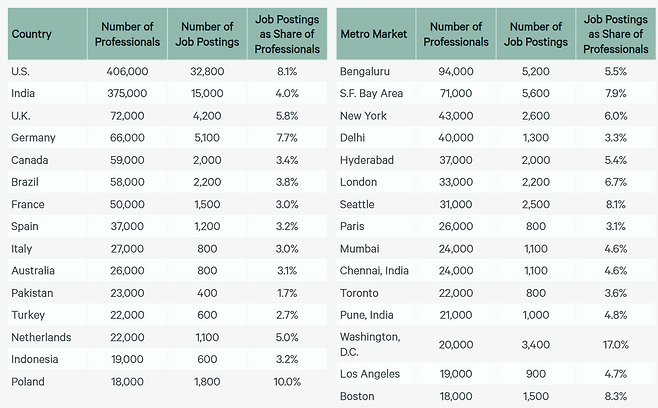 인재들은 샌프란시스코, 뉴욕시, 시애틀, 토론토, 워싱턴 D.C 등 지역에 가장 많이 거주하고 있다. 특히 실리콘밸리가위치한 샌프란시스코는 AI 개발 관련 구인 공고가 가장 많이 게재돼 있는 지역이다. AI 개발자가 몰리면서 샌프란시스코의 집값, 사무실 임대료도 증가하고 있다.