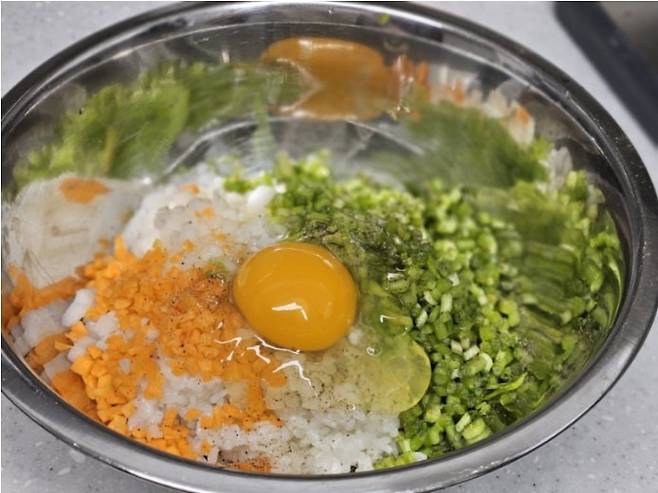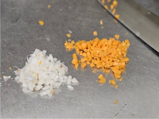 당근과 양파는 조금씩 다져주세요. 이 둘은 맛을 내는 메인재료가 아니니까 미나리보다 적게 넣어요.