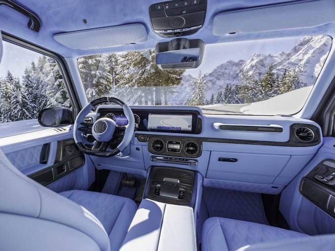 브라부스는 외관뿐 아니라 실내 디자인도 과감하게 커스터마이징했다. 실내는 하늘색 계열의 가죽과 알칸타라 소재로 마감됐다.