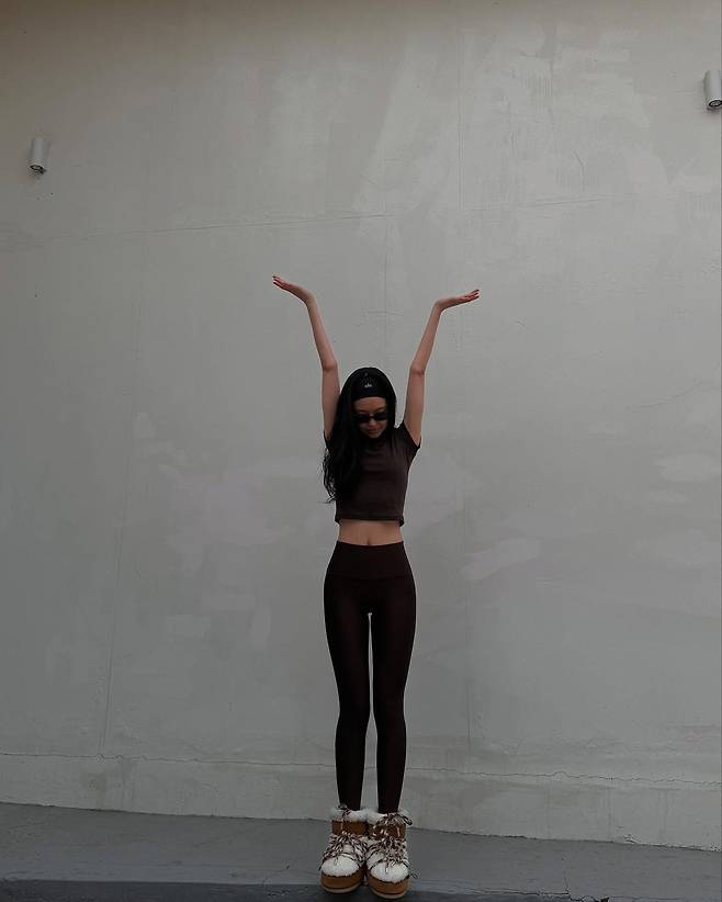 사진 속 손나은은 올리브 그린 컬러의 타이트한 레깅스와 반팔 톱을 매치해 심플하면서도 세련된 룩을 완성했다. 상하의를 같은 컬러로 맞춘 모노톤 스타일링은 그녀의 균형 잡힌 몸매를 더욱 돋보이게 만들었다. 특히 발목을 감싸는 퍼 부츠가 더해져 추운 날씨에도 실용적이면서도 멋스러운 포인트를 더했다.