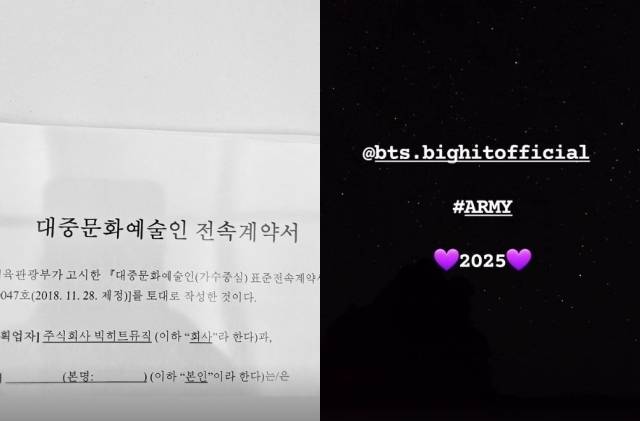 멤버 RM은 빅히트 뮤직과의 '대중문화예술인 전속계약서'를 직접 공개한 후 "bts.bighitofficial #ARMY 2025"이라는 문구로 2025년 방탄소년단 완전체를 기대케 했다.